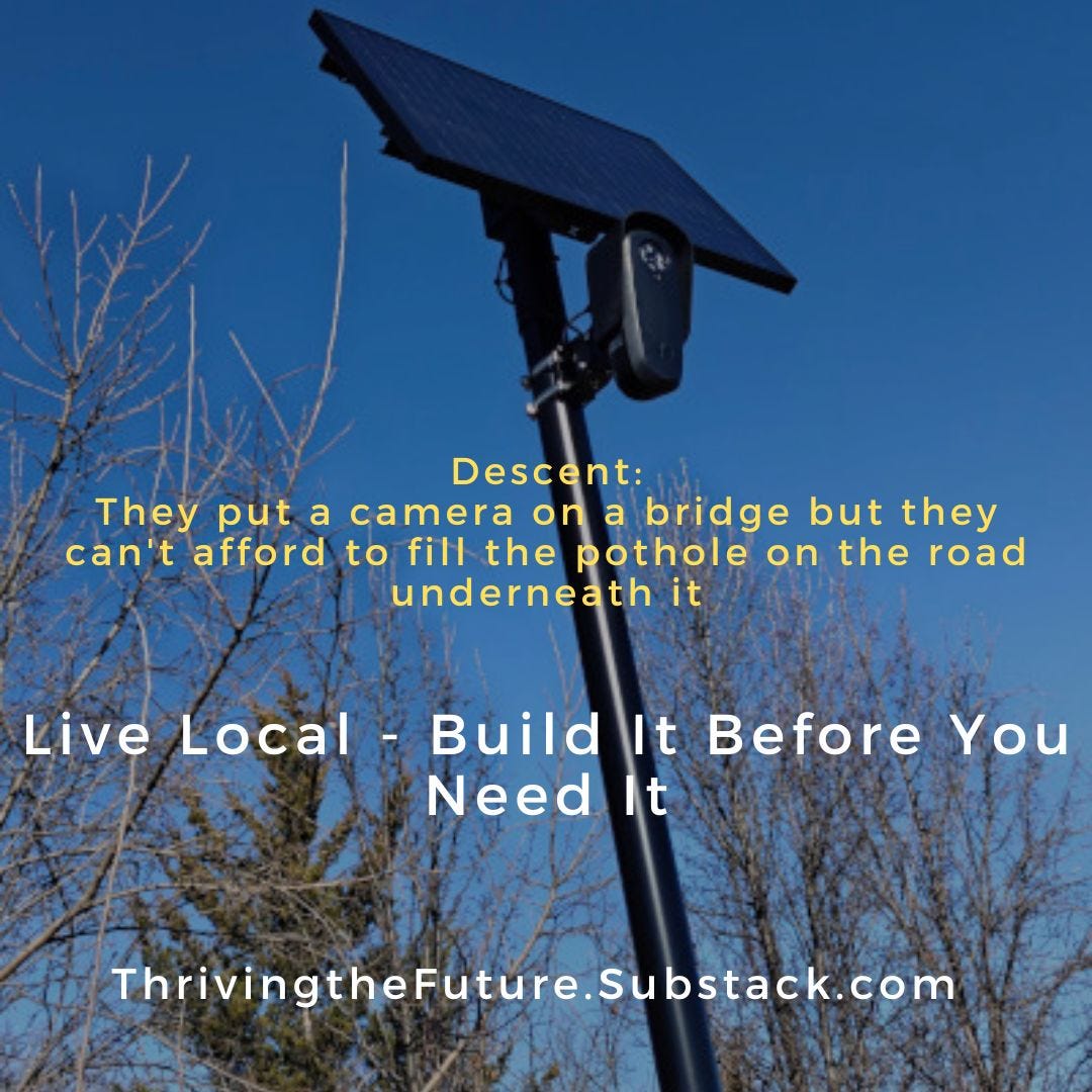 That’s what descent looks like. It’s not a dramatic event, just the services getting a little thinner, a little less reliable, until people go and figure it out with whoever’s nearby. That’s messy localism. And it’s already happening.
