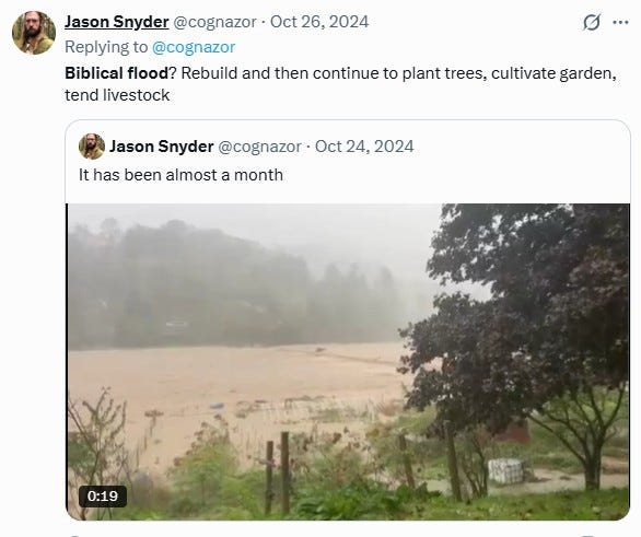 After Hurricane Helene, Jason Snyder posted it the way only Jason would: “Biblical flood? Rebuild and then continue to plant trees, cultivate gardens, tend livestock.”